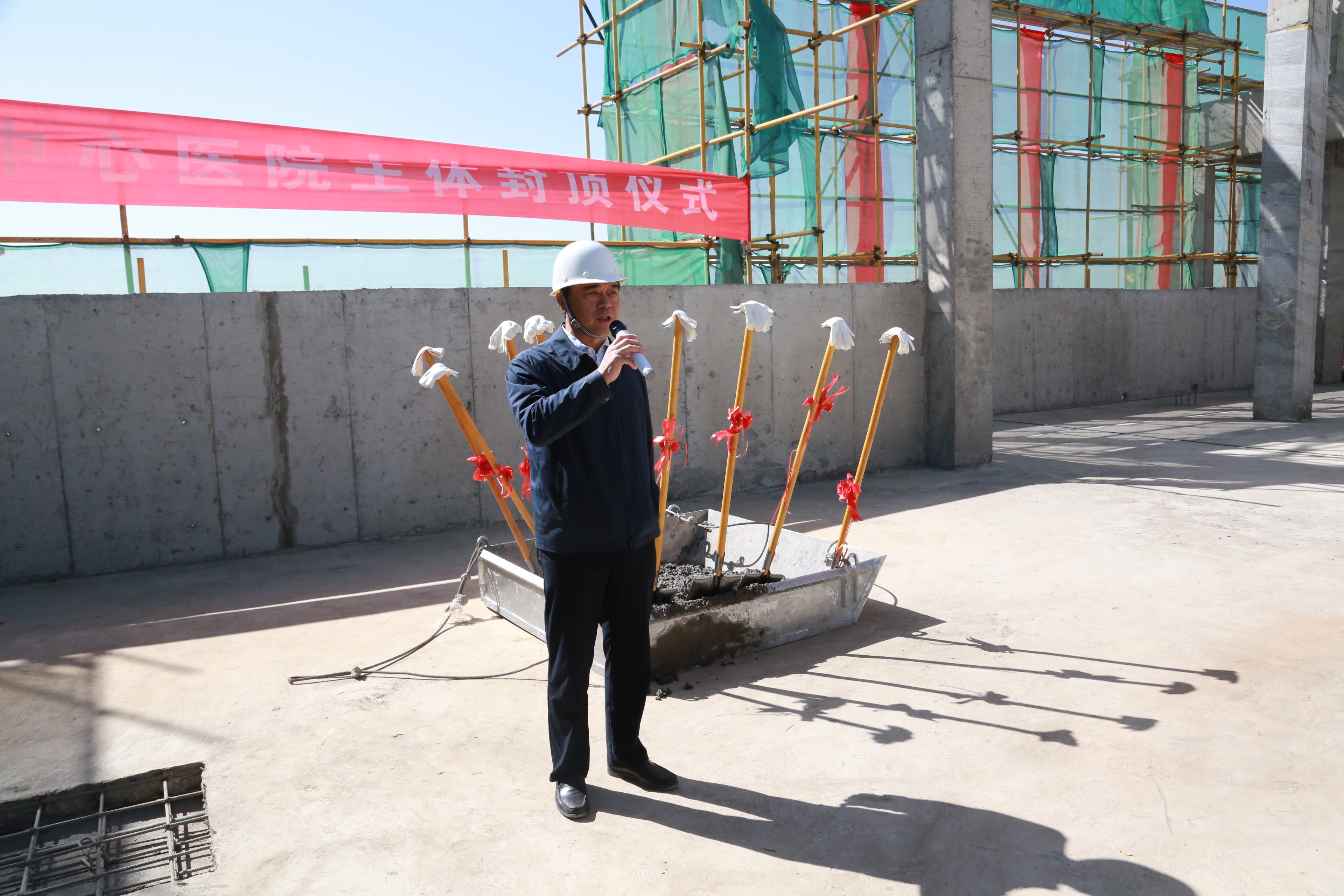 9月29日上午,位于蘭州新區的省殘疾人綜合服務基地建設再傳捷報。隨著省康復中心醫院院住部樓頂最后一塊混凝土澆筑完成,康復中心醫院主體工程的順利封頂,標志著省殘疾人綜合服務基地建設任務邁上新臺階,也標志著省康復中心醫院工程建設取得了重要的階段性勝利,將由土建主體結構轉入裝飾裝修階段。省殘聯黨組書記、理事長華文哲,黨組成員、副理事長蔣錄基、吳小萍、張秀麗,副巡視員李少惠及長城建設集團、藍野建設監理公司等施工監理單位高級管理層出席封頂儀式。