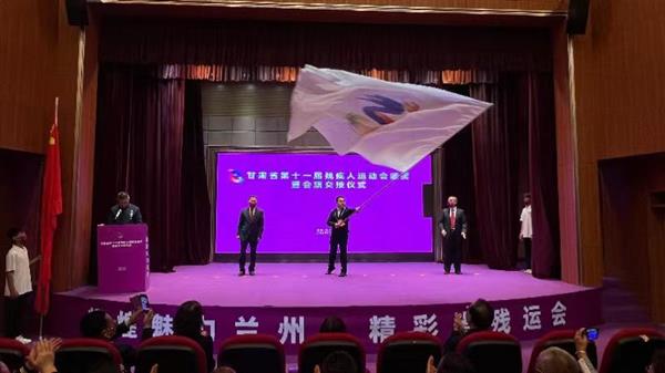 圖為蘭州市與下一屆省殘運會主辦城市定西市交接省殘運會會旗
