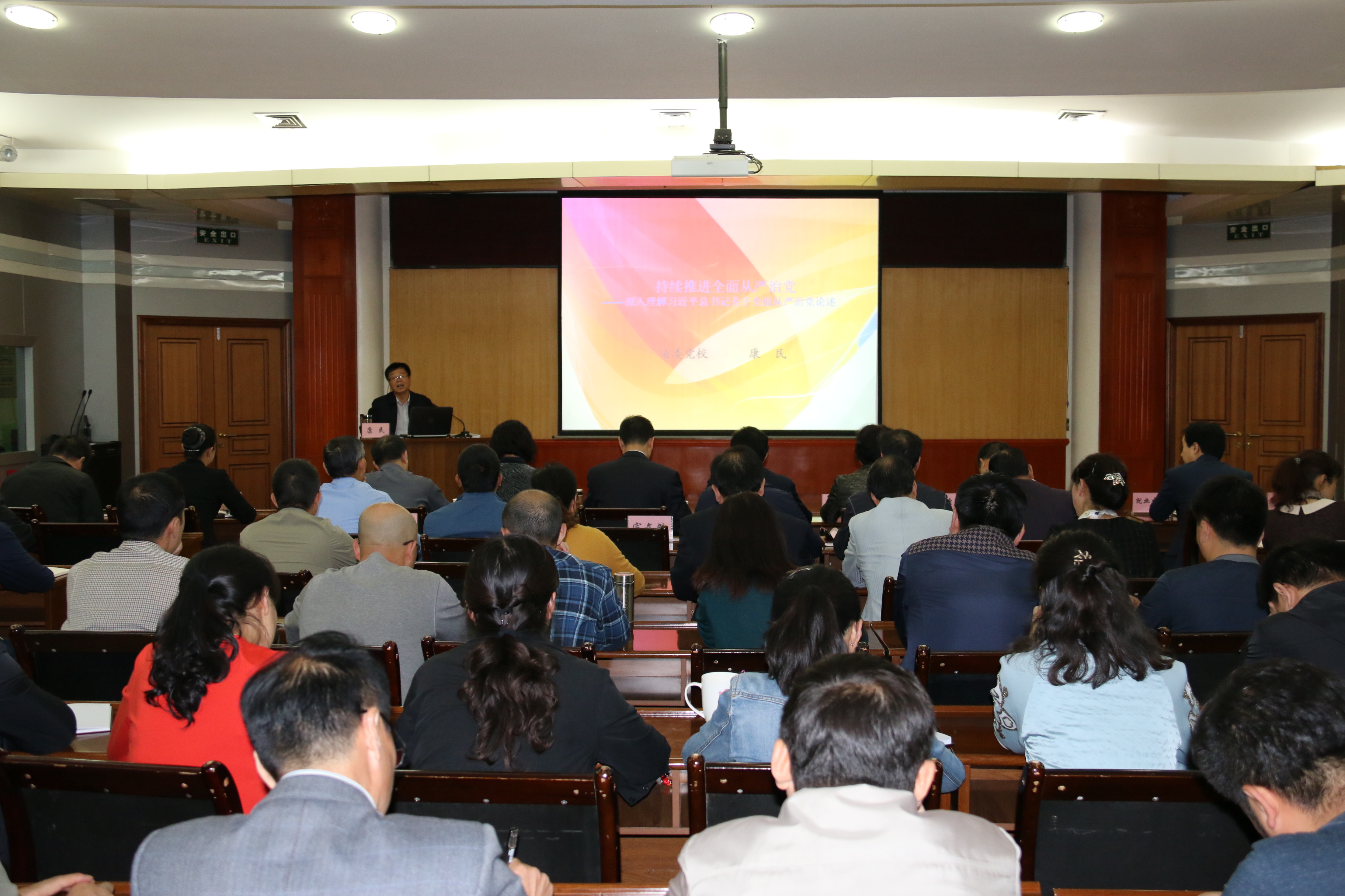 講座上,康民教授用生動形象的語言和豐富事例,從黨的領導、偉大斗爭、鐵的紀律、關鍵少數、作風建設、黨內生活、反腐倡廉、主體責任等8個關鍵詞入手,深入淺出的講解了全面從嚴治黨的歷史背景、時代意義和重點問題等,并從堅持黨要管黨、從嚴治黨,把握從嚴治黨規律,不斷深化作風建設,推進反腐倡廉建設等方面做了精彩解讀。