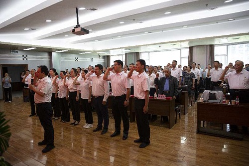 慶祝活動在王建強同志“我志愿加入中國共產黨......”的領誓聲中拉開帷幕,首先舉行了新黨員入黨宣誓、老黨員重溫入黨誓詞儀式;之后王建強同志向朱雪明、趙彥達、楊清友等10名黨齡超過50年的老黨員,逐一頒發了“光榮在黨50年”紀念章,現場響起熱烈的掌聲,經久不息。