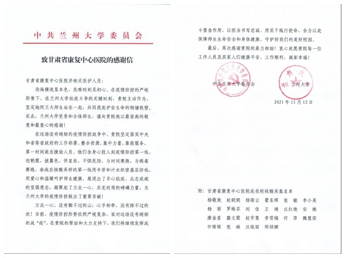 蘭州大學黨委向省康復中心醫院和醫護人員致信 感謝抗疫精神