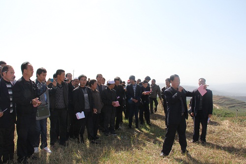 圖為殘疾人學員在天水市秦安縣劉坪何灣萬畝優質蜜桃基地認真聽秦安縣果業局局長徐保祥介紹基地建設情況