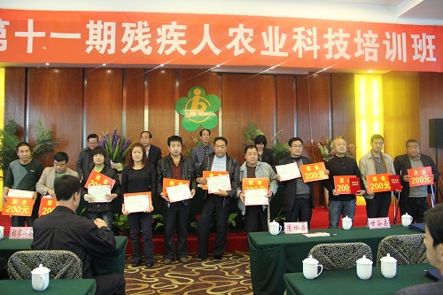 圖為全省第十一期殘疾人農業科技培訓班結業儀式上為優秀學員頒發榮譽證書及獎金