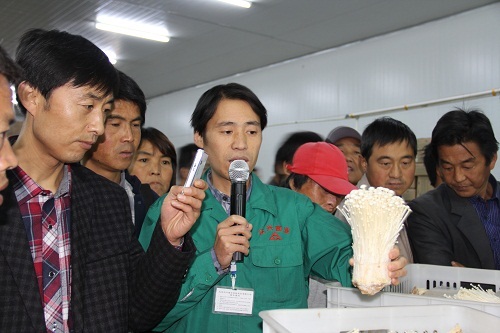 圖為圖為殘疾人學員在天水市農業高新技術示范園區金針菇工廠化生產繁育現場認真聽技術人員講解