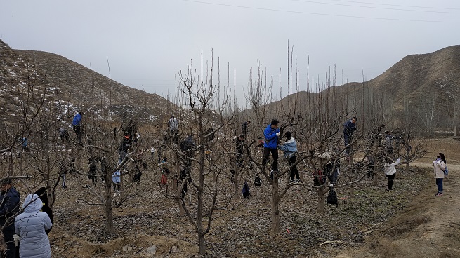 此次實習正值初冬時節,又剛逢降雪,果園內寒風凜冽,但實習師生仍一絲不茍,熱情飽滿,整個示范基地充滿了歡聲笑語,呈現出一片熱火朝天的景象,學生們蓬勃向上的精神狀態,為寒冷的果園增添了一道靚麗的風景線。在剪枝過程中,我中心干部職工積極參與,抓住機會向農大教授請教,與學生們一起動手實踐,學習了果樹修剪技術,明確了果樹整形修剪的重要性,掌握了果樹修剪因樹制宜,隨勢做型的要領,進一步提高了專業技能。